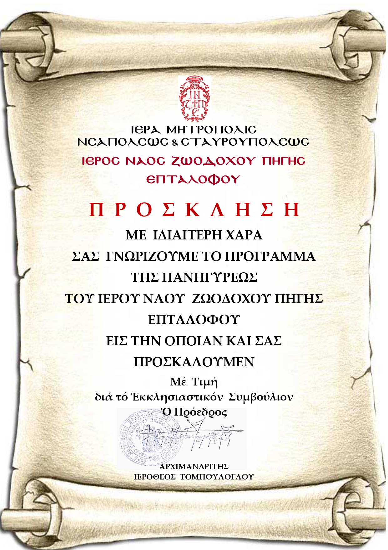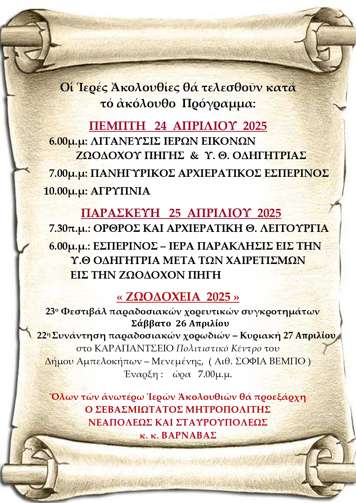 Πρόγραμμα Πανηγυρικού εορτασμού Ιερού Ναού Ζωοδόχου Πηγής Αμπελοκήπων και Ζωοδοχείων 2025