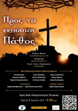 Στο πλαίσιο των εκδηλώσεων «Ευαγγελίστρια 2025» και στον κύκλο «Μια Πέμπτη, μια Σαρακοστή» στην Ευαγγελίστρια Πειραιώς, σήμερα Πέμπτη 4 Απριλίου στις 20.00, θα παρουσιαστεί η μουσική εκδήλωση «Πρός τό κούσιον Πάθος…».