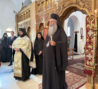 Μετά το καλωσόρισμα στην κεντρική είσοδο, ο Μακαριώτατος ενδύθηκε Αρχιερατικό Μανδύα, σύμφωνα με τη μοναχική παράδοση και σχηματίστηκε πομπή προς το Καθολικό, όπου τελέστηκε η Ακολουθία Υποδοχής, κατά την εκκλησιαστική τάξη.
