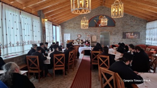 «Όλοι μας αυτή τη στιγμή είμαστε μοναχοί και προσπαθούμε ο καθένας με το δικό του τρόπο και με τις δικές του δυνάμεις να ανταποκριθούμε στις υποσχέσεις που δώσαμε κατά τη μοναχική μας κουρά. Όλοι μας έχουμε ακολουθήσει την ισάγγελη πολιτεία και απολαμβάνουμε το προνόμιο να έχουμε όλη μας τη ζωή στραμμένη μόνο στο Χριστό. Σε Εκείνον ανήκουμε ολοκληρωτικά και δεν θα πρέπει να υπάρχει τίποτα πάνω από την αγάπη του Χριστού. Γι’ αυτή την αγάπη του Χριστού πρέπει να είμαστε έτοιμοι να θυσιάσουμε τα πάντα και να θυσιαζόμαστε καθημερινά με τον τρόπο που ο καθένας μπορεί και γνωρίζει» ανέφερε ο Σεβασμιώτατος και ευχήθηκε αυτή η Σύναξη να γίνει θεσμός και να πραγματοποιείται κάθε χρόνο. Τέλος εξέφρασε τη χαρά του για την απόφαση της Ιεράς Κοινότητος του Αγίου Όρους να εγκρίνει την έλευση της Ιεράς Εικόνος του «Άξιον Εστί» για τους εορτασμούς των 200 ετών από την Έξοδο του Μεσολογγίου.