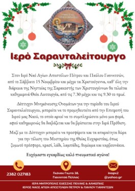 Στον ιερό ενοριακό ναό των Αγίων Αποστόλων Πέτρου και Παύλου Γιαννιτσών θα τελεσθεί ιερό Σαρανταλείτουργο από το Σάββατο 15 Νοεμβρίου και για όλη την περίοδο της νηστείας των Χριστουγέννων υπέρ ζώντων και κεκοιμημένων.