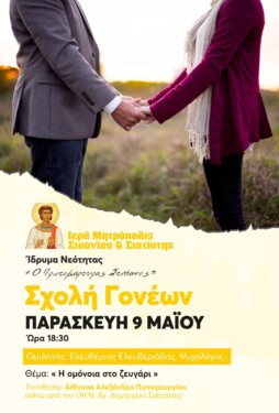 Ομιλητής θα είναι ο κ. Ελευθέριος Ελευθεριάδης, ψυχολόγος, με θέμα : “Η ομόνοια στο ζευγάρι”.