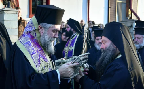 Ακολούθως, τελέσθηκε επίσημος Δοξολογία, επί τη ελεύσει του ιερού λειψάνου, στο τέλος της οποίας, ο Σεβασμιώτατος, αφού ευχαρίστησε, διά θερμών λόγων, τόσο τον Σεβασμιώτατο Μητροπολίτη Σταγών και Μετεώρων κ. Θεόκλητο και τον σεπτό Καθηγούμενο της Μονής Αγίων Πάντων Βαρλαάμ, πανοσιολ. Αρχιμανδρίτη π. Βενέδικτο, όσο και τους κομίσαντες το ιερό λείψανο, π. Βαρλαάμ και π. Σάββα, ομίλησε προς το πολυπληθές εκκλησίασμα, τονίζοντας μεταξύ άλλων και τα εξής:
