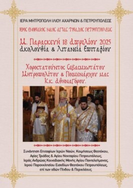 Στην ενορία Αγίας Τριάδος Πετρουπόλεως θα χοροστατήσει ο Σεβασμιώτατος Μητροπολίτης Ιλίου κ. Αθηναγόρας την Μ. Παρασκευή 18 Απριλίου 2025, στην Ακολουθία του Επιταφίου και τη λιτάνευσή του, κατά την οποία θα γίνει συνάντηση των Επιταφίων των ενοριών Αγίας Τριάδος, Κοιμήσεως Θεοτόκου και Αγίου Νεκταρίου Πετρουπόλεως, της Ιεράς Ανδρώας Κοινοβιακής Μονής Αγίου Παντελεήμονος Πετρουπόλεως και του Ιερού Παρεκκλησίου Εισοδίων Θεοτόκου επί των οδών Πίνδου και Περικλέους στην Πετρούπολη.