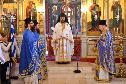 Τον πλαισίωσαν ο Παν. Αρχιμ. π. Δωρόθεος Ζέρβας, Πρωτοσύγκελλος της Ιεράς Μητροπόλεως και οι Αιδ. Πρωτ. π. Ιωάννης Κοτσέα, Προϊστάμενος του Ιερού Ναού του Αγίου Νικολάου και π. Μακάριος Ζωνάρας ο και εκλεκτός και λαμπρός Εφημέριος του Καθεδρικού Ναού του Γενεσίου της Θεοτόκου.