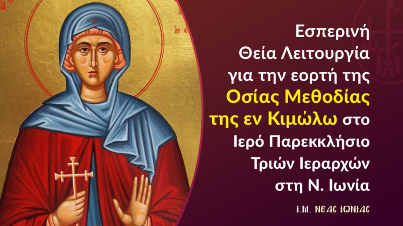 Με την ευκαιρία της εορτής της Οσίας Μητρός ημών Μεθοδίας της εν Κιμώλω, την Παρασκευή 10 Οκτωβρίου και ώρες 6:00μ.μ.-9:00μ.μ. θα τελεσθεί εκ μεταθέσεως Εσπερινή Θεία Λειτουργία στο Ιερό Παρεκκλήσιο των Αγίων Τριών Ιεραρχών και του Αγίου Λουκά του Ιατρού στη Νέα Ιωνία (οδ. Μεσολογγίου 27). Κατά τη διάρκεια της Εσπερινής Θείας Λειτουργίας θα τεθούν