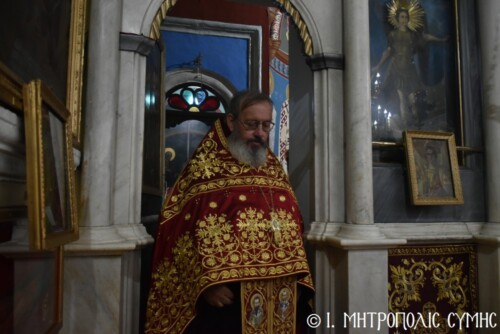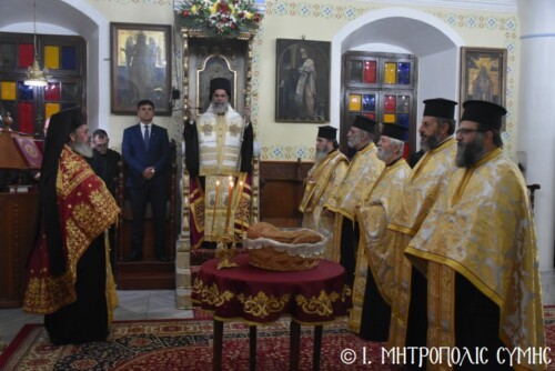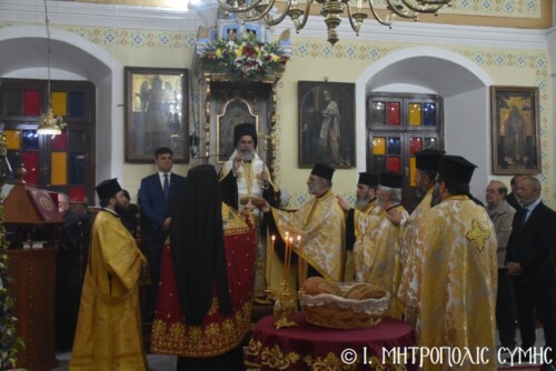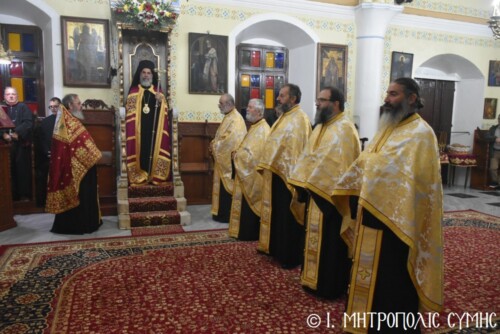 Σήμερα τό πρωΐ, Πέμπτη 13η Νοεμβρίου, κυριώνυμη ἡμέρα τῆς ἑορτῆς, ὁ Σεβ. Μητροπολίτης  κ. Χρυσόστομος, χοροστάτησε στόν Ὄρθρο καί τέλεσε τήν Θ. Λειτουργία ὁμοίως στόν Ἱερό Μητροπολιτικό Ναό τοῦ Τιμίου Προδρόμου Σύμης μέ συλλειτουργούς του τόν Πανοσιολ. Καθηγούμενο τῆς Ἱ. Μονῆς Πανορμίτου Ἀρχιμ. Ἀντώνιο Πατρό, Ἐψηφισμένο Ἐπίσκοπο Ροδοστόλου, ὁ ὁποῖος προτροπῇ τοῦ Σεβ. Μητροπολίτου μας ἐκήρυξε τόν θεῖον λόγον, τόν Γενικό Ἀρχιερατικό Ἐπίτροπο καί Ἐφημέριο τοῦ Μητροπολιτικοῦ Ναοῦ Πρωτοπρ. Στέφανο Μακρῆ, τόν Οἰκονόμον π. Χρῆστο Σταθόπουλο καί τούς Πρεσβυτέρους, π. Παντελεήμονα Μακρόπουλο, τόν π. Γεώργιο Χατζηχρυσάφη, τόν π. Ἀντώνιο Μανιᾶ, τόν π. Γεώργιο Κακακιό καί τούς Διακόνους π. Παῦλο Τερεζάκη καί π. Νικόλαο Καρμανιῶλο. Ξεχωριστές παρουσίες ἦταν τοῦ Δημάρχου Σύμης κ. Ἐλευθερίου Παπακαλοδούκα, τοῦ Ἀντιδημάρχου Σύμης κ. Νικήτα Γρύλλη, τοῦ Στρατιωτικοῦ Διοικητοῦ Δ.Α.Ν. Σύμης, Συνταγματάρχη κ. Χαραλάμπους Κατηφόρη, τοῦ Διοικητοῦ τοῦ 549 Τ.Ε. Ἀντισυνταγματάρχη κ. Εὐαγγέλου Καρσιώτη, τοῦ Λιμενάρχη Σύμης κ. Σταύρου Μακρῆ, τῆς Προέδρου τῆς Ἑνώσεως Γυναικῶν Σύμης κ. Σεβαστῆς Νικόλη καί τῶν ἐκπροσώπων τῶν λοιπῶν τοπικῶν Ἀρχῶν, Φορέων καί Συλλόγων.