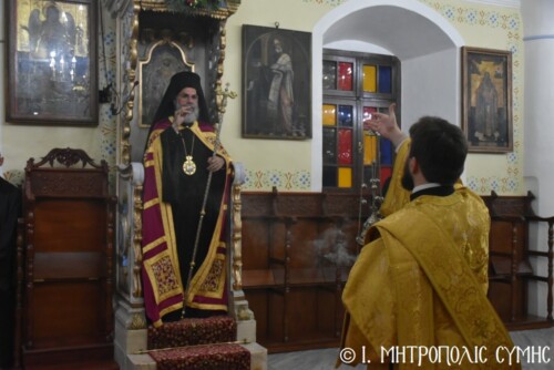 Τό ἑσπέρας τῆς Τετάρτης 12ης Νοεμβρίου, ἐτελέσθη ὁ Μέγας Πανηγυρικός Ἑσπερινός, χοροστατοῦντος τοῦ Σεβασμιωτάτου, πλαισιουμένου ὑπό τοῦ Ἱεροῦ κλήρου τῆς Νήσου . Τά δέ ἀναλόγια διακόνησαν γλυκυφθόγγως δεξιά, ὁ Πρωτοψάλτης τοῦ Μητροπολιτικοῦ Ναοῦ κ. Δημοσθένης Γιανναρᾶς μετά τοῦ υἱοῦ του κ. Μερκουρίου καί ὁ κ. Εὐάγγελος Λαγός καί ἀριστερά ὁ Ἱεροψάλτης κ. Ἐλευθέριος Ξηράκης. Μεταξύ τῶν συμμετεχόντων πιστῶν, παρέστησαν ὁ Δήμαρχος Σύμης κ. Ἐλευθέριος Παπακαλοδούκας μετά τοῦ Ἀντιδημάρχου κ. Νικήτα Γρύλλη, ὁ Στρατιωτικός Διοικητής Δ.Α.Ν. Σύμης, Συνταγματάρχης κ. Χαράλαμπος Κατηφόρης, ὁ Διοικητής τοῦ 549 Τ.Ε. Σύμης Ἀντισυνταγματάρχης κ. Εὐάγγελος Καρσιώτης καί ἄλλοι ἐκπρόσωποι τοπικῶν Φορέων καί Συλλόγων. Μετά τήν ἀπόλυση, οἱ συμμετέχοντες κληρικοί καί λαϊκοί ἀνέβηκαν στό παρακείμενο Ἀρχονταρίκι τοῦ Ναοῦ, ὅπου ἕκαστος εὐχήθη στόν ἑορτάζοντα Μητροπολίτη μας καί ἐδέχθη τά ἑόρτια κεράσματα.