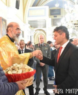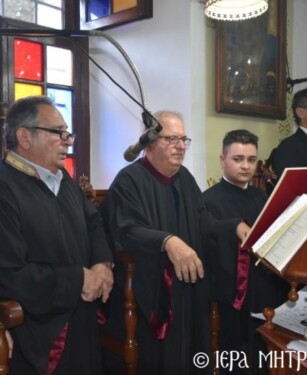 Ἐν συνεχείᾳ, τό πυκνό ἐκκλησίασμα μετέβη στό Μητροπολιτικό Μέγαρο, ὅπου εὐχήθη καί αὖθις στόν ἑορτάζοντα Ποιμενάρχη του, δεχόμενο πλούσια δοχή καί ἑόρτια κεράσματα.