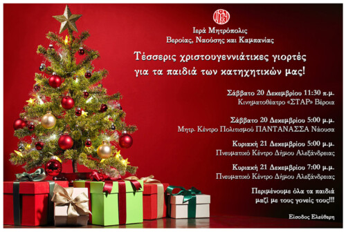 Το Σαββατοκύριακο 20 και 21 Δεκεμβρίου το Γραφείο Ποιμαντικής Διακονίας της Αποστολικής Ιεράς Μητροπόλεως Βεροίας, Ναούσης και Καμπανίας θα πραγματοποιήσει τέσσερις χριστουγεννιάτικες γιορτές για τα παιδιά των κατηχητικών τμημάτων όλων των ενοριών της Μητροπόλεως μας.
