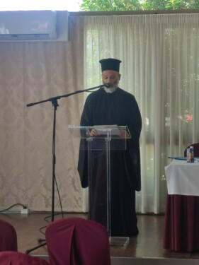 Κατόπιν, ο Σεβασμιώτατος Πρόεδρος της Συνοδικής Επιτροπής επί του Τύπου, των Δημοσίων Σχέσεων και της Διαφωτίσεως ευχαρίστησε τον Σεβασμιώτατο Μητροπολίτη Πατρών κ. Χρυσόστομο για την φιλοξενία και απηύθηνε χαιρετισμό. Μεταξύ άλλων ο Σεβασμιώτατος τόνισε ότι, όπως οι Πατέρες της Εκκλησίας μετέφεραν ανόθευτο το ευαγγελικό μήνυμα χρησιμοποιώντας την γλώσσα και τα μέσα της εποχής τους, έτσι και εμείς πρέπει να ανακαλύπτουμε νέους τρόπους εκφοράς του εκκλησιαστικού λόγου προς τους θύραθεν για να μπορούμε να κάνουμε πράξη διαρκώς την προτροπή του Κυρίου βάζοντας πάντα τον καινό οίνο του ευαγγελικού μηνύματος σε νέους ασκούς.