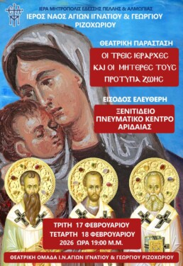 Η Θεατρική Ομάδα της ενορίας Αγίων Ιγνατίου και Γεωργίου Ριζοχωρίου Αλμωπίας παρουσιάζει το θεατρικό έργο με τίτλο: «Οι Τρεις Ιεράρχες και οι μητέρες τους, πρότυπα ζωής».