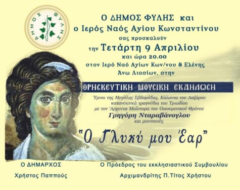 ΟΔήμος Φυλής και ο Ιερός Ναός Αγίων Κωνσταντίνου και Ελένης Άνω Λιοσίων σας προσκαλούν την Τετάρτη 9 Απριλίου 2025 και ώρα 20:00 στον Ιερό Ναό Αγίων Κωνσταντίνου και Ελένης Άνω Λιοσίων στη Θρησκευτική μουσική εκδήλωση με τίτλο «Ο Γλυκύ μου Έαρ», με ύμνους της Μεγάλης Εβδομάδας, Κάλαντα του Λαζάρου και κατανυκτικά τραγούδια του Τριωδίου, με τον Άρχοντα Μαΐστορα του Οικουμενικού Θρόνου Γρηγόρη Νταραβάνογλου και μουσικούς.