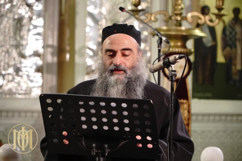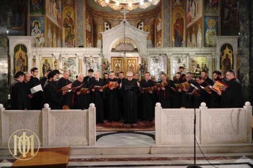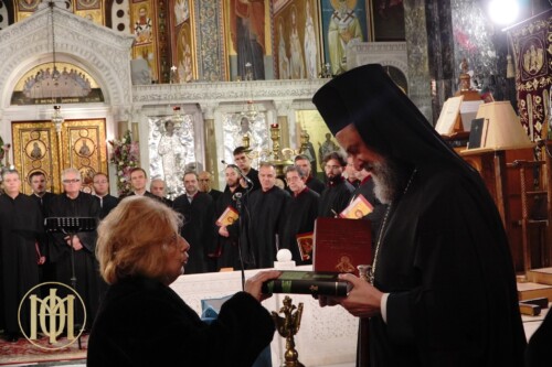 Αμέσως μετά ο χορός των μελών της Σχολής Βυζαντινής Μουσικής της Μητροπόλεως υπό τη διεύθυνση του κ. Χαράλαμπου Τζινευράκη έψαλε τρία μελοποιημένα από τον τιμώμενο Ιεροψάλτη άσματα.
