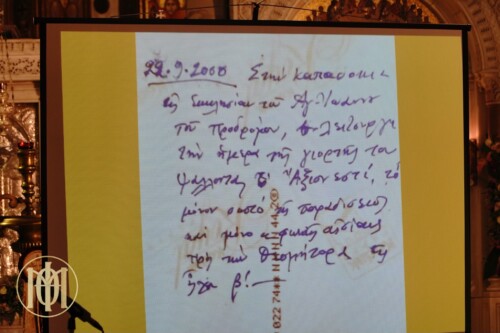 Κατά το τέλος της εκδήλωσης ο Ποιμενάρχης ευχαρίστησε όλους όσοι συνέβαλαν στην πραγματοποίηση της εν λόγω εκδήλωσης. Ο Επίσκοπός μας ευχαρίστησε ιδιαιτέρως τον κ. Γιαννόπουλο και την ομάδα του, που απαρτιζόταν από μεταπτυχιακούς και προπτυχιακούς φοιτητές του, οι οποίοι βοήθησαν στην άρτια διεξαγωγή της εκδήλωσης, καθώς επίσης και τον Διευθυντή της Σχολής Βυζαντινής Μουσικής, κ. Χαράλαμπο Τζινευράκη, και τα μέλη του βυζαντινού χορού, που έψαλαν άριστα τους μελοποιημένους από τον αείμνηστο Άρχοντα ύμνους.