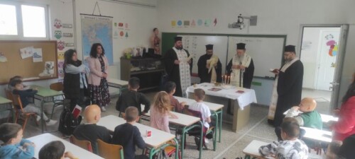 Τον Σεβασμιώτατο υποδέχθηκαν ο εφημέριος της Ενορίας Αγ. Γεωργίου Βατώντα αρχιμ. Ιερόθεος Παπαγρηγορίου, ο προϊστάμενος των διδασκόντων κ. Χαράλαμπος Παπανικολάου, οι διδάσκοντες και οι μικροί μαθητές, καθώς και τα μικρά παιδιά του παρακείμενου Νηπιαγωγείου συνοδευόμενα από τις νηπιαγωγούς τους.
