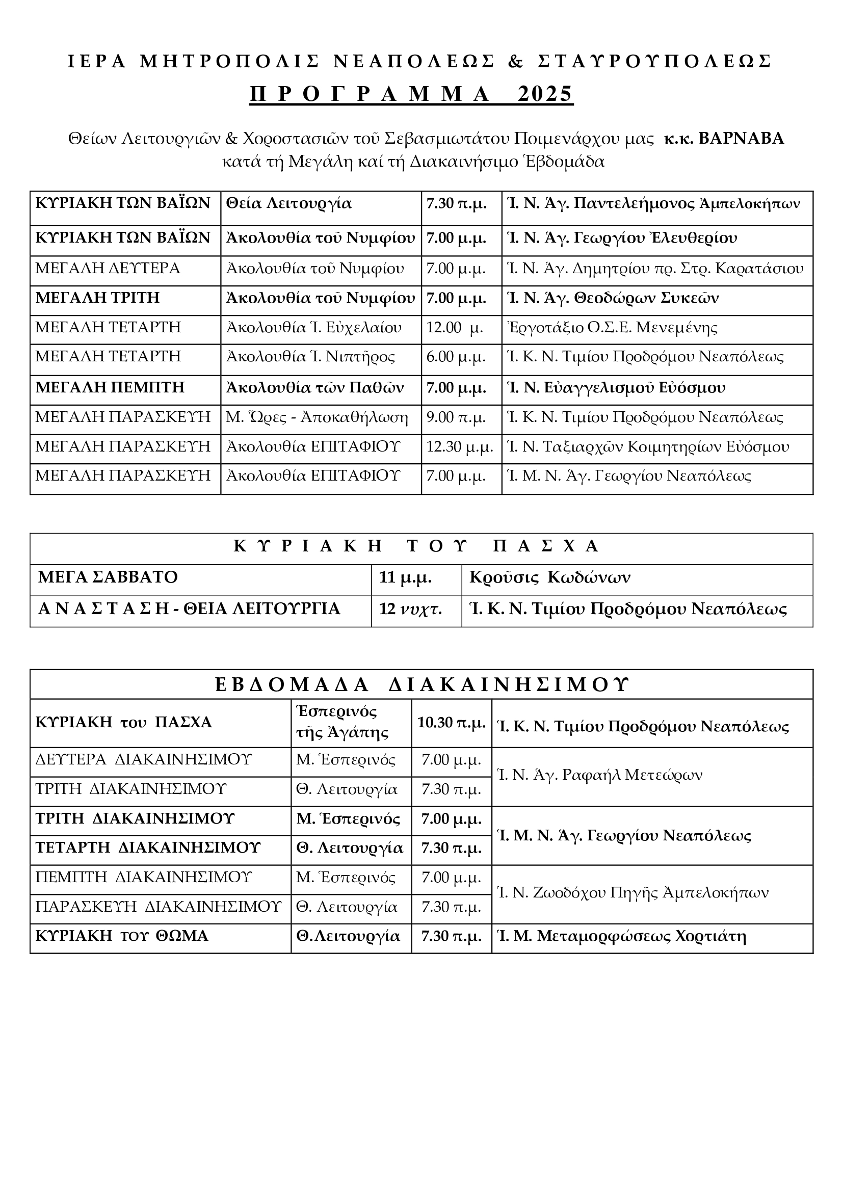 Το πρόγραμμα του Μητροπολίτης Νεαπόλεως και Σταυρουπόλεως κ. Βαρνάβα