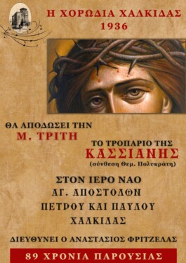 Τη Μεγάλη Τρίτη, 15 Απριλίου 2025, η Χορωδία Χαλκίδας 1936 -με ευλογία και πρόνοια του Σεβασμιωτάτου Μητροπολίτου Χαλκίδος κ.κ. Χρυσοστόμου- θα συμμετάσχει στην κατανυκτική Ακολουθία του Νυμφίου, αποδίδοντας το φημισμένο Τροπάριο της Κασσιανής σε σύνθεση του διακεκριμένου μουσουργού Θεμιστοκλή Πολυκράτη, στον Ιερό Ναό Αγίων Αποστόλων Πέτρου & Παύλου στη Χαλκίδα.